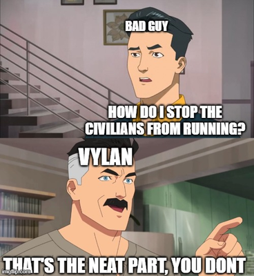 Elbow-deep in trouble, they found a woman trapped inside and put their hearts into rescuing her, running into some assailants on the way out that they managed to take down before the woman was taken down too. The situation became hairy and Vylan got angry. He and Za took the final assailant out before Vylan tried to muscle through to the guards at the front of the apartment. Zadirra eyeballed the situation remotely but lost her nerve and made the gut-wrenching decision to trigger a nerve agent to flood the building. Doing so cost an arm and a leg, resulting in Vylan's death.
