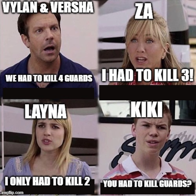 Upon returning, Layna explained that she had made an ally, along with the Regicide situation. Zadirra explained that without any other options she had stopped Vylan and that he was dead with Za badly injured. When Versha tried to leave, Node locked the door and refused to let her out until she swore to not throw the mission. With that agreement, Node unlocked the door and Versha fled.